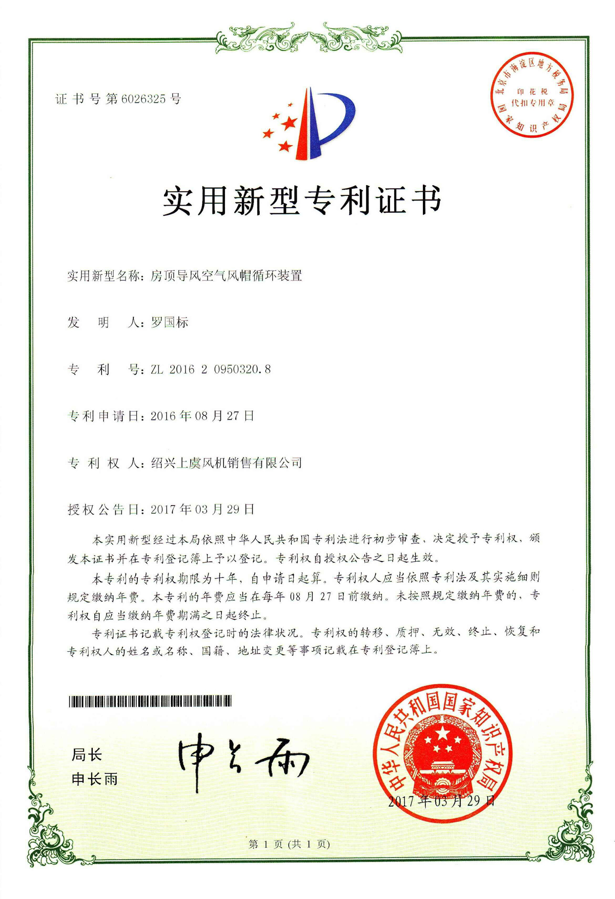 房頂導(dǎo)風(fēng)空氣風(fēng)帽循環(huán)裝置專(zhuān)利證書(shū) |