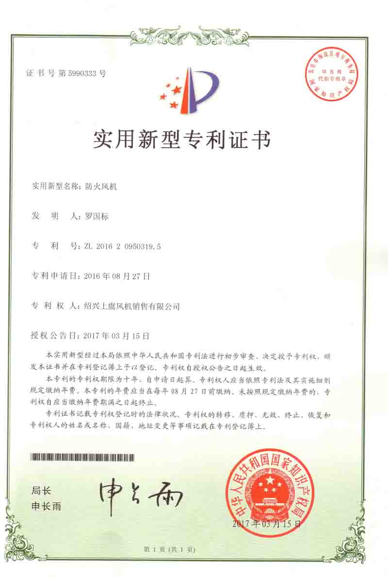 | 防火風(fēng)機(jī)專(zhuān)利證書(shū) |