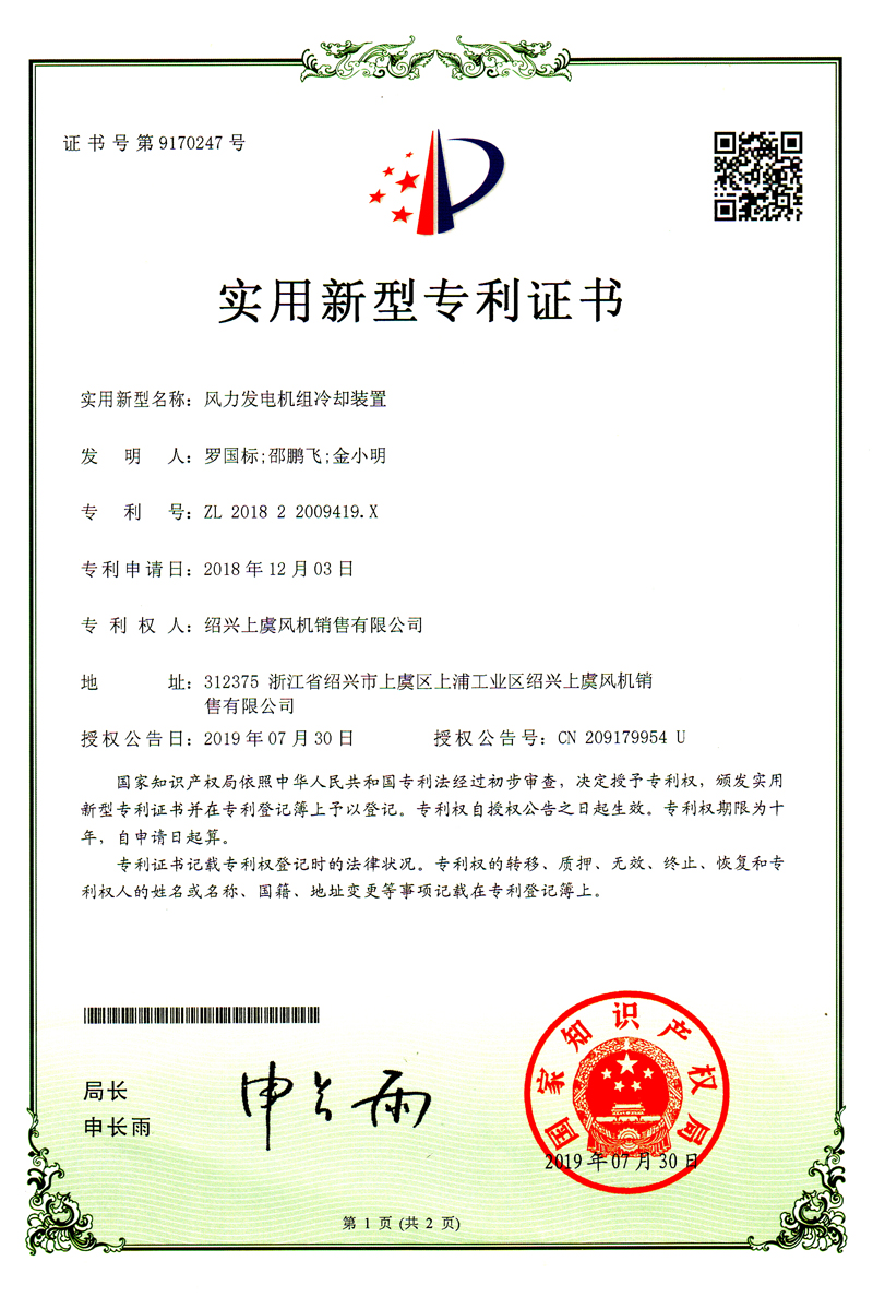 風(fēng)力發(fā)電機(jī)足冷卻裝置專(zhuān)利證書(shū) |