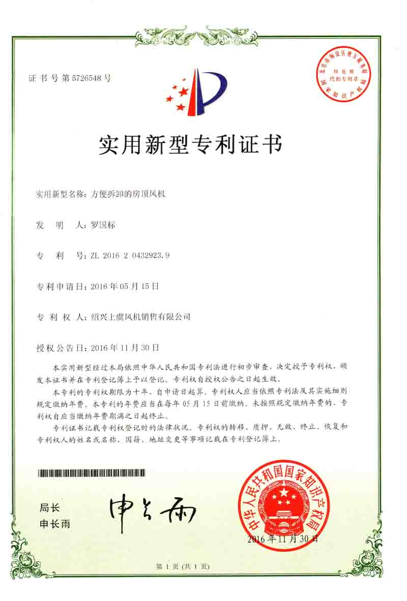 方便拆卸的房頂風(fēng)機(jī)專(zhuān)利證書(shū) |